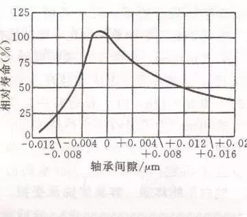滾動軸承間隙與預(yù)緊滾動軸承存在較大間隙時,載荷將集中作用于受力方向上的少數(shù)滾動體上,使得軸承剛度下降,承載能力下降,受力低,旋轉(zhuǎn)精度差。微信jx-gscom 機械公社圈 將滾動軸承進(jìn)行適當(dāng)預(yù)緊,使?jié)L動體與內(nèi)外圈滾道在接觸處產(chǎn)生預(yù)變形,受載后承載的滾動體數(shù)量增多,受力趨向均勻,提高了承載能力和剛度,有利于減少主軸回轉(zhuǎn)軸線的漂移,提高了旋轉(zhuǎn)精度。若過盈量太大,軸承的摩擦磨損加劇,使受力將顯著下降,軸承壽命與間隙之間的關(guān)系如下圖所示。