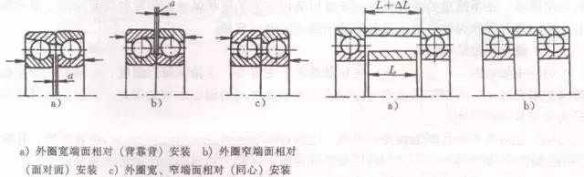 角接觸球軸承間隙調(diào)整和預(yù)緊的方法如圖所示。成對使用的角接觸球做成是將軸承內(nèi)圈端面或外圈端面磨去后實現(xiàn)。軸承生產(chǎn)廠家按要求的預(yù)緊量成對提供,裝配時不需要再調(diào)整,用螺母將其并緊后即可獲得精確的預(yù)緊力。由于使用中不能調(diào)整,維修比較麻煩。