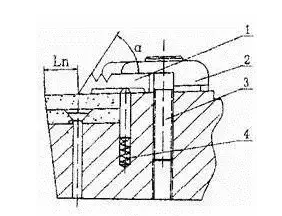 在車刀前刀面上裝一個擋屑板1,切屑沿刀具的前面流出時,因受擋屑板1所阻而彎曲折斷。斷屑器的參數(shù)Ln和α可按需要設(shè)計和調(diào)整,以保證在給定的切削條件下,斷屑穩(wěn)定可靠。松開螺釘3, 在彈簧4的作用下,可使擋屑板1和壓板2一起抬起,便于擋屑板調(diào)整和刀片的快速轉(zhuǎn)位與更換。這種斷屑器常用于大、中型機床的刀具上。