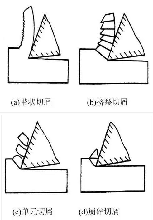 加工中心產(chǎn)生切屑不可避免,由于工件材料不同,切削條件各異.切削過程中生成的切屑形狀是多種多樣的。切屑的形狀主要分為帶狀、節(jié)狀、粒狀和崩碎四種類型,如下圖所示。