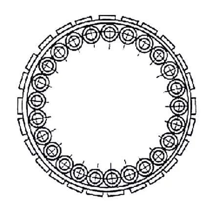 此刀庫結(jié)構(gòu)簡單,應(yīng)用較多。如上圖所示,由于刀庫呈環(huán)形排列,空間利用率低,因此出現(xiàn)了刀具在盤中進行雙環(huán)和多環(huán)排列,以增加空間的利用率的設(shè)計。但這樣一來,刀庫的外徑較大,轉(zhuǎn)動慣量也很大,選刀時間也較長。因此,盤式刀庫一般適用于刀具容量較小的刀庫。