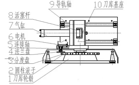 斗笠式自動換刀裝置其刀庫橫移裝置采用氣壓傳動,而刀庫分度裝置則采用槽輪機構(gòu)來實現(xiàn)。