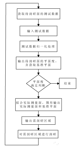若上述已測(cè)的待刮研面的平面度不滿足要求,則繼續(xù)下述步驟 :在 MATLAB 軟件根 據(jù)矩陣 A、矩陣 B 歸一化處理后的數(shù)值擬合出待刮研面,并且輸出待刮研面和待刮研面的基 準(zhǔn)面的圖形,再輸出待刮研面上高于待刮研面的基準(zhǔn)面上的需刮研區(qū)域,操作人員根據(jù)該 輸出的需刮研區(qū)域再根據(jù)平板對(duì)研法采用刮研用平板對(duì)其進(jìn)行刮研,刮研完畢后返回開始 獲取刮研后的表面的多個(gè)點(diǎn),重復(fù)上述步驟,直至平面度滿足要求為止。