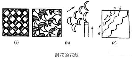 4、刮花階段:目的是使鑄鐵平臺(tái)的刮研平面美觀,并在滑動(dòng)工件之間造成良好的滑動(dòng)條件。常見的花紋有斜紋花、魚鱗花和半月花,如下圖所示。鑄鐵平臺(tái)常見的是斜紋花。