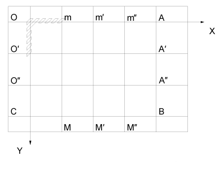 首先獲取待刮研面上多個(gè)點(diǎn)的坐標(biāo),并將這多個(gè)點(diǎn)的橫坐標(biāo)和縱坐標(biāo)分別記錄在矩陣A、矩陣B中。獲取這多個(gè)點(diǎn)時(shí),可以采用網(wǎng)格法來獲取。網(wǎng)格法獲取多個(gè)點(diǎn)時(shí)如圖2所示, 基準(zhǔn)平面由兩條直線OmX 和 OO’Y 確定,直線 OX 和 OY 最好選擇成互相垂直的兩條線,并分 別平行于待刮研面的輪廓邊。測(cè)量時(shí)先測(cè)量 OA 和 OC 每條線的輪廓,再測(cè)量 O’A’、O’’A’’ 和 CB 縱向線的輪廓,以便覆蓋整個(gè)待刮研面,測(cè)量完畢后可沿 mM、m’M 等作追加測(cè)量,以進(jìn) 一步證實(shí)上述測(cè)量。當(dāng)待刮研面的寬度與其長(zhǎng)度不相稱時(shí),可同時(shí)沿對(duì)角線測(cè)量,即所謂的 交叉檢查。測(cè)量時(shí)可采用精密水平儀進(jìn)行測(cè)量。