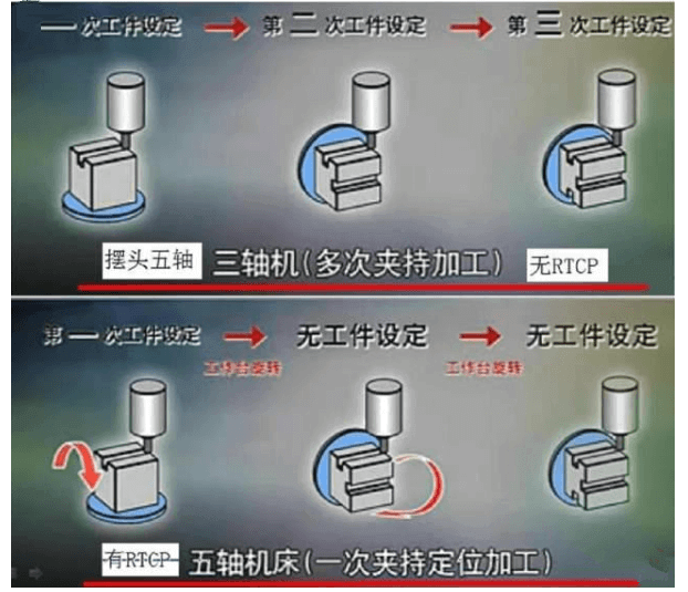 是否是真五軸,不是看五個軸是否聯(lián)動,假五軸也可五軸聯(lián)動。主軸要是有RTCP真五軸的算法。就是做分度加工,有RTCP功能的真五軸只要設置一個坐標系,只需要一次對刀設坐標。而假五軸則麻煩很多。