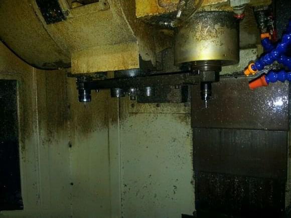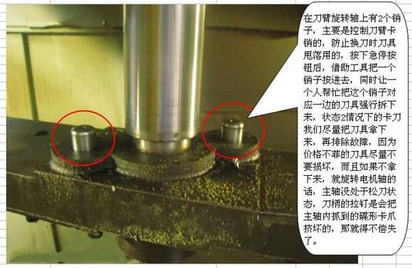1.需要2人協(xié)調(diào)操作,一人爬到設(shè)備刀庫(kù)上,下面一個(gè)關(guān)注刀臂情況,刀庫(kù)上有一個(gè)換刀機(jī)械手臂電機(jī)(刀臂正上方的一個(gè)馬達(dá))