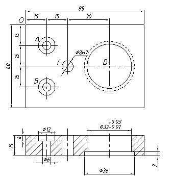 如圖所示的零件,其上共有4個孔,兩個精度要求不高的φ6/φ12的沉頭孔,可以直接鉆頭鉆穿,后采用φ12的立銑刀擴出沉孔。φ8H7的通孔要求精度較高,可以先采用φ7.8的鉆頭先鉆穿,留0.2mm的余量進行鉸削加工,保證精度。φ36的沉孔為了保證孔的同軸度和表面的垂直度可以采用背鏜工藝,因此該零件安排的加工工藝過程如下: